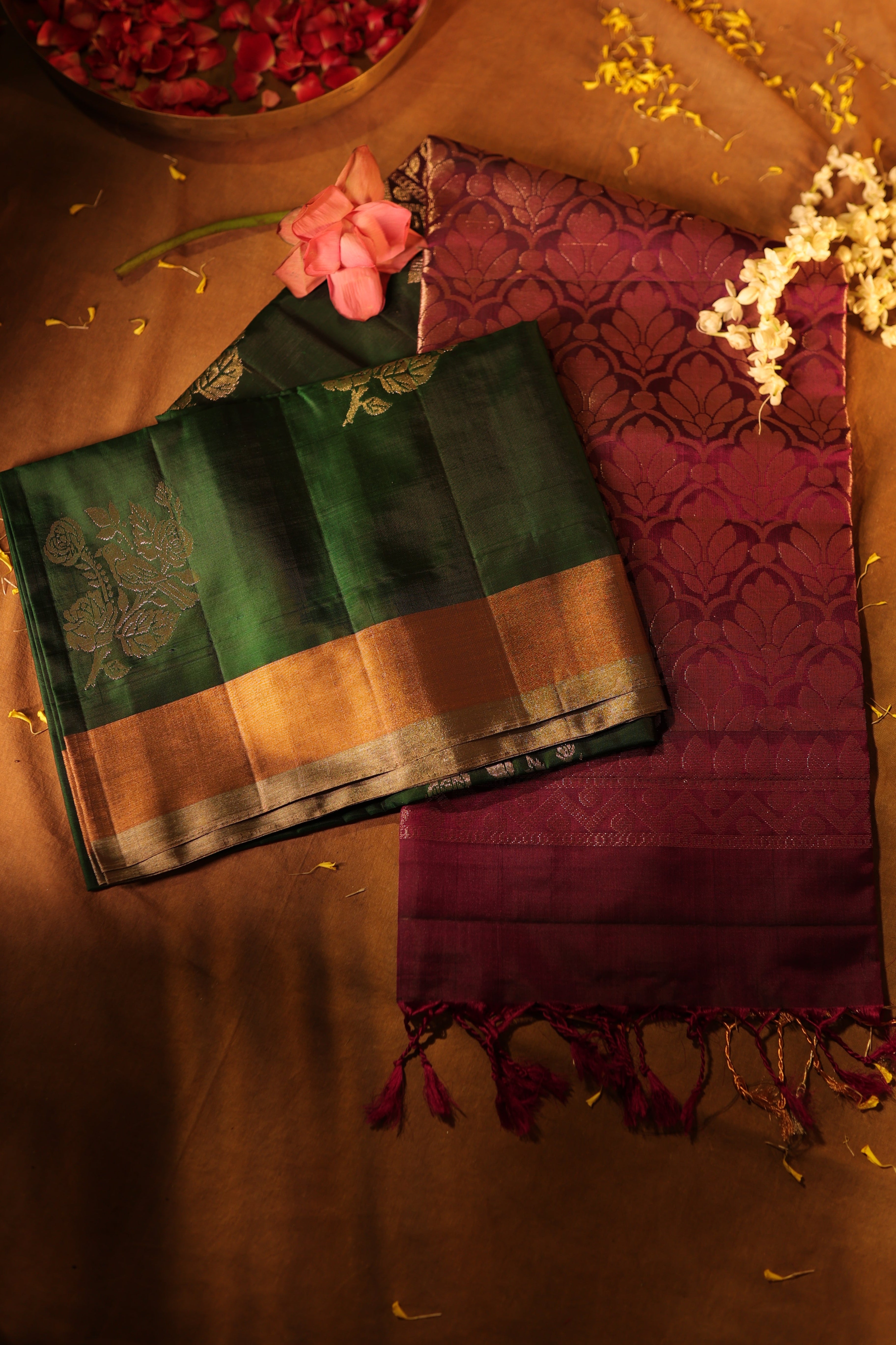 Antique Zari Kanchipuram Silk Bottle Green Saree