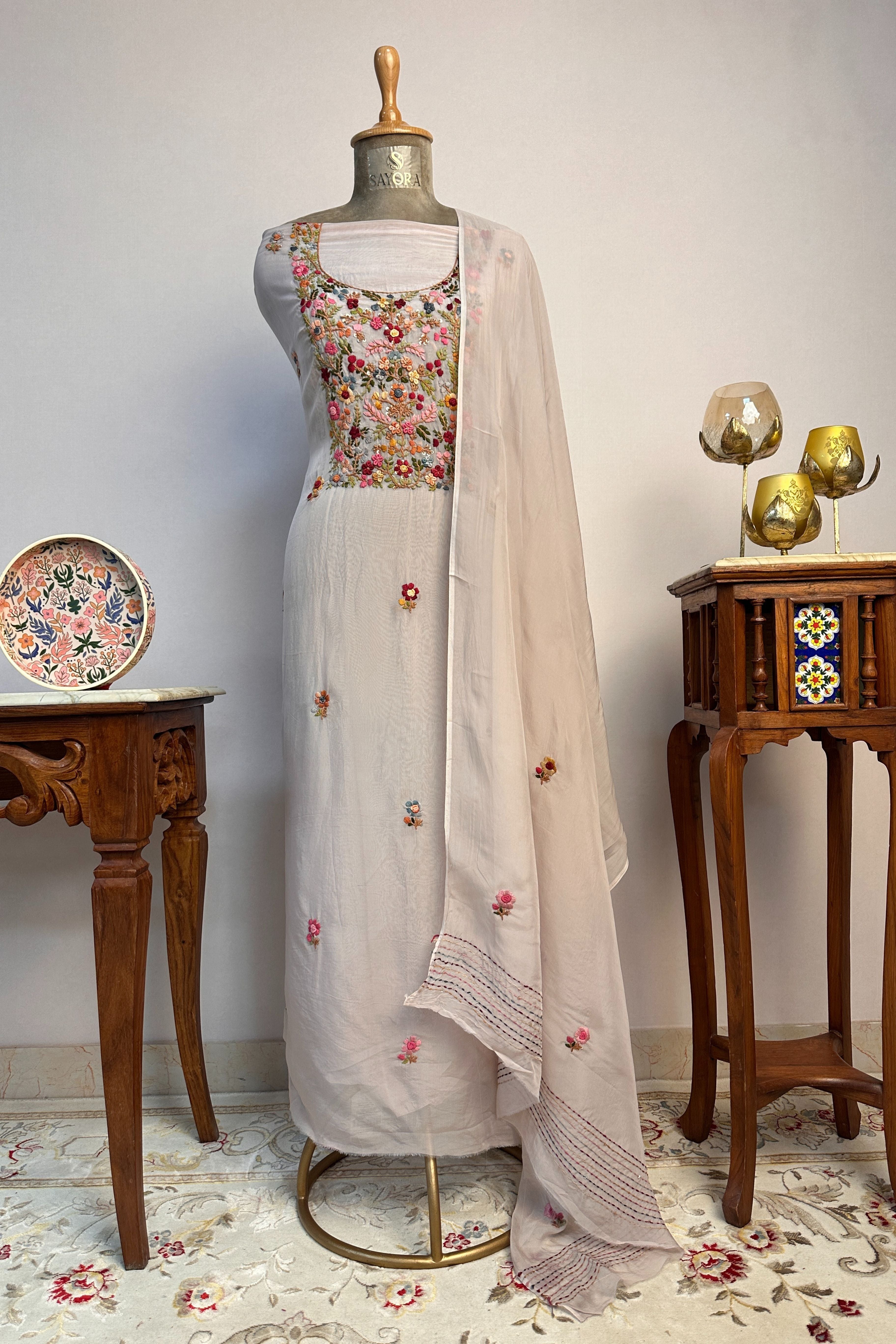 Organza French Knot embroidered Neutral Pink Unstiched Suit Set