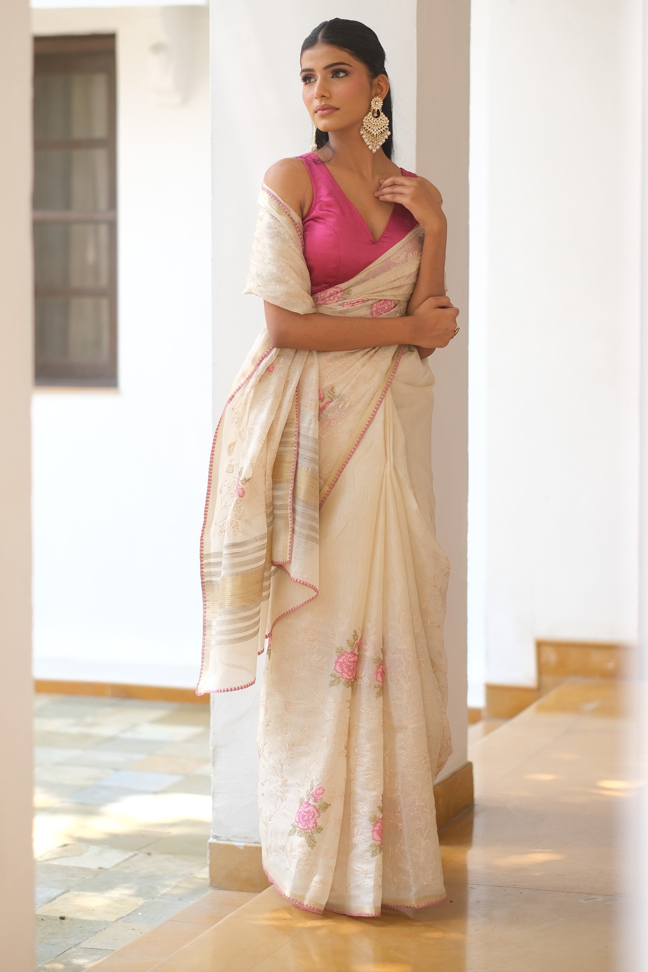 Pink Raw Linen Silk Summer Special Saree With Stitched Designer Blouse