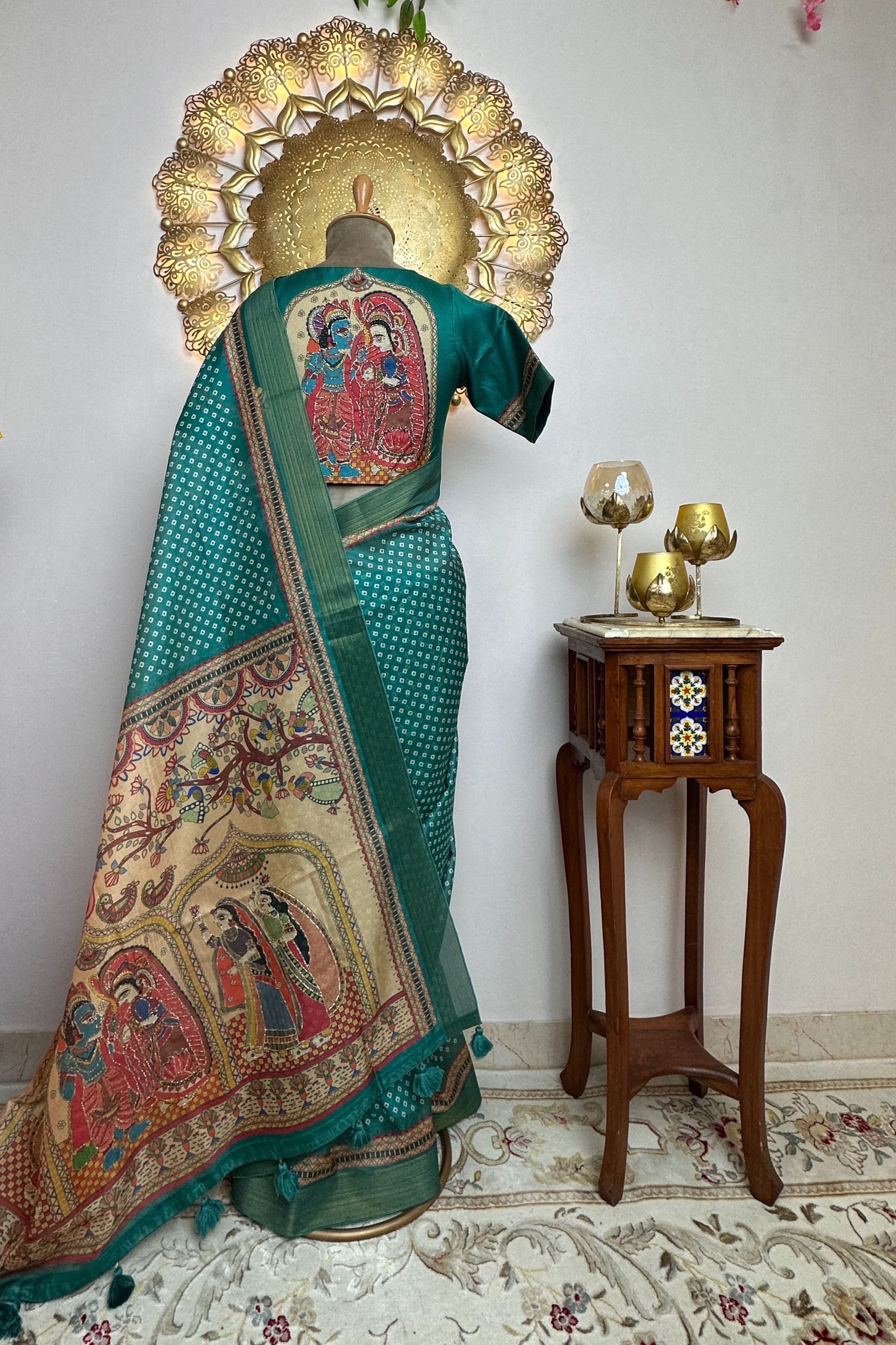 'Radha-Krishna' Madhubani Linen Saree with Stitched Designer Blouse