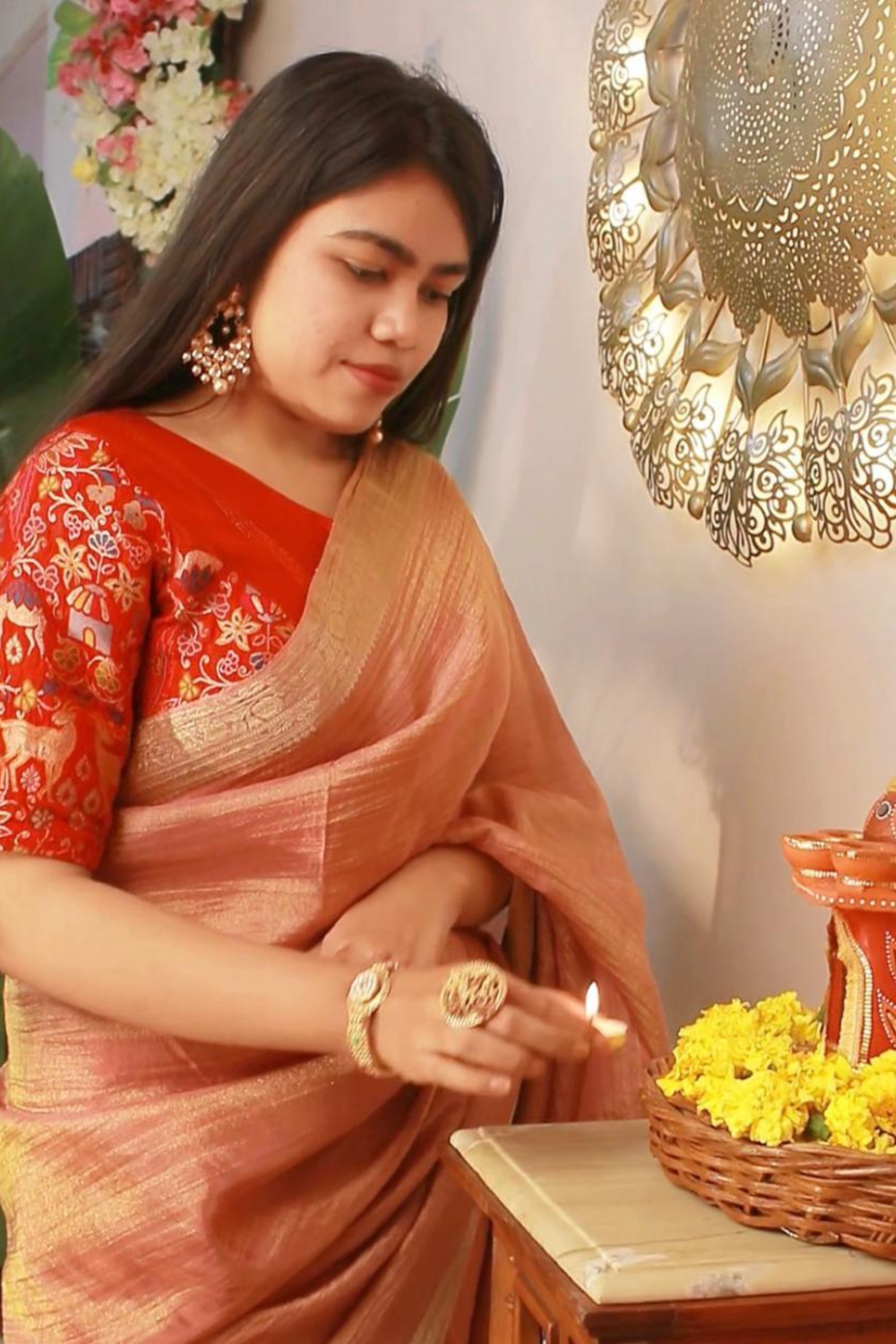 Tissue Silk Saree with Stitched Goddess Laxmi Designer Blouse