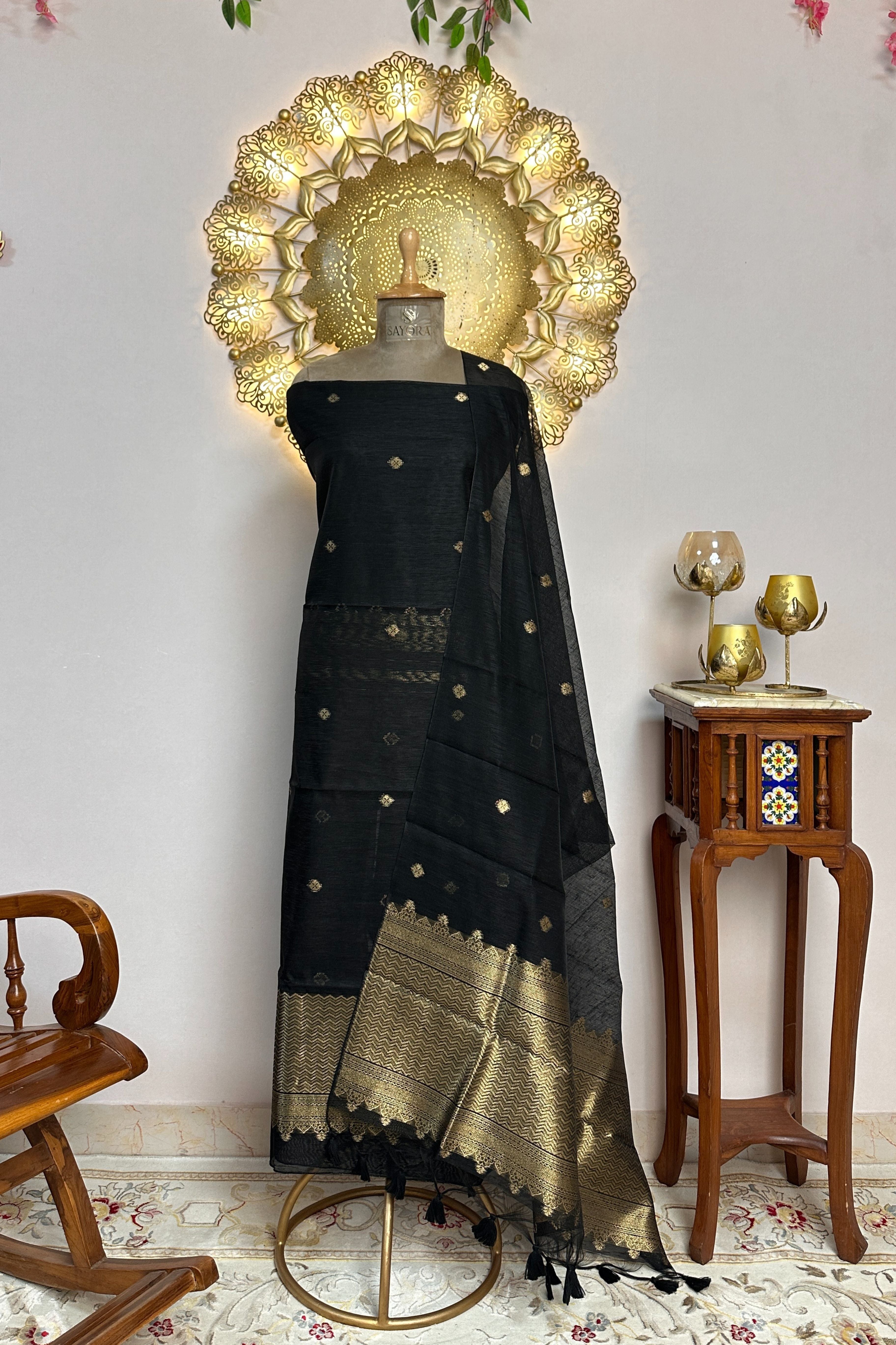 Black Chanderi Gold Zari Jamdani Weaving Unstitched suit Set