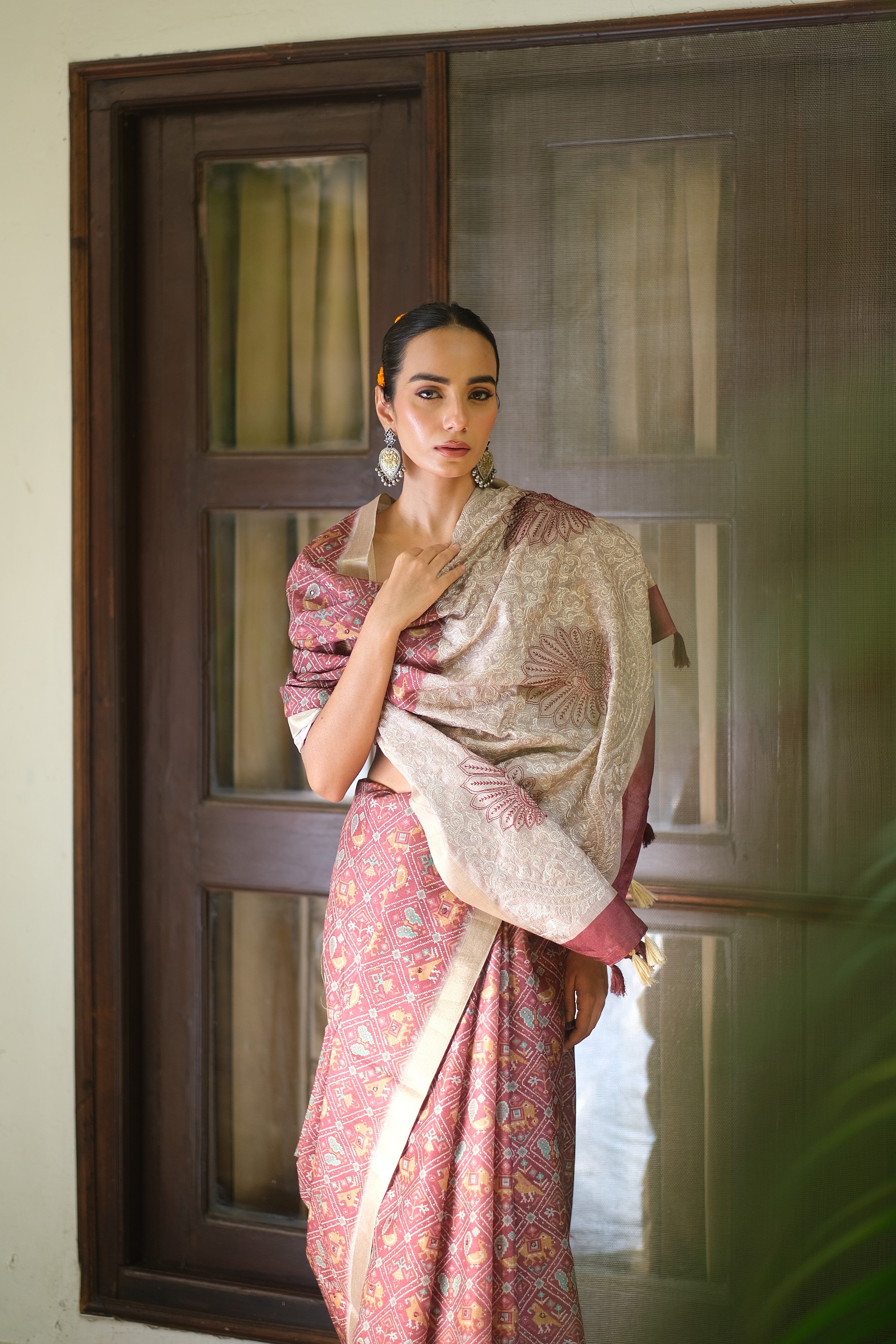 Grey modal silk floral print Elephant nakshi zari woven saree