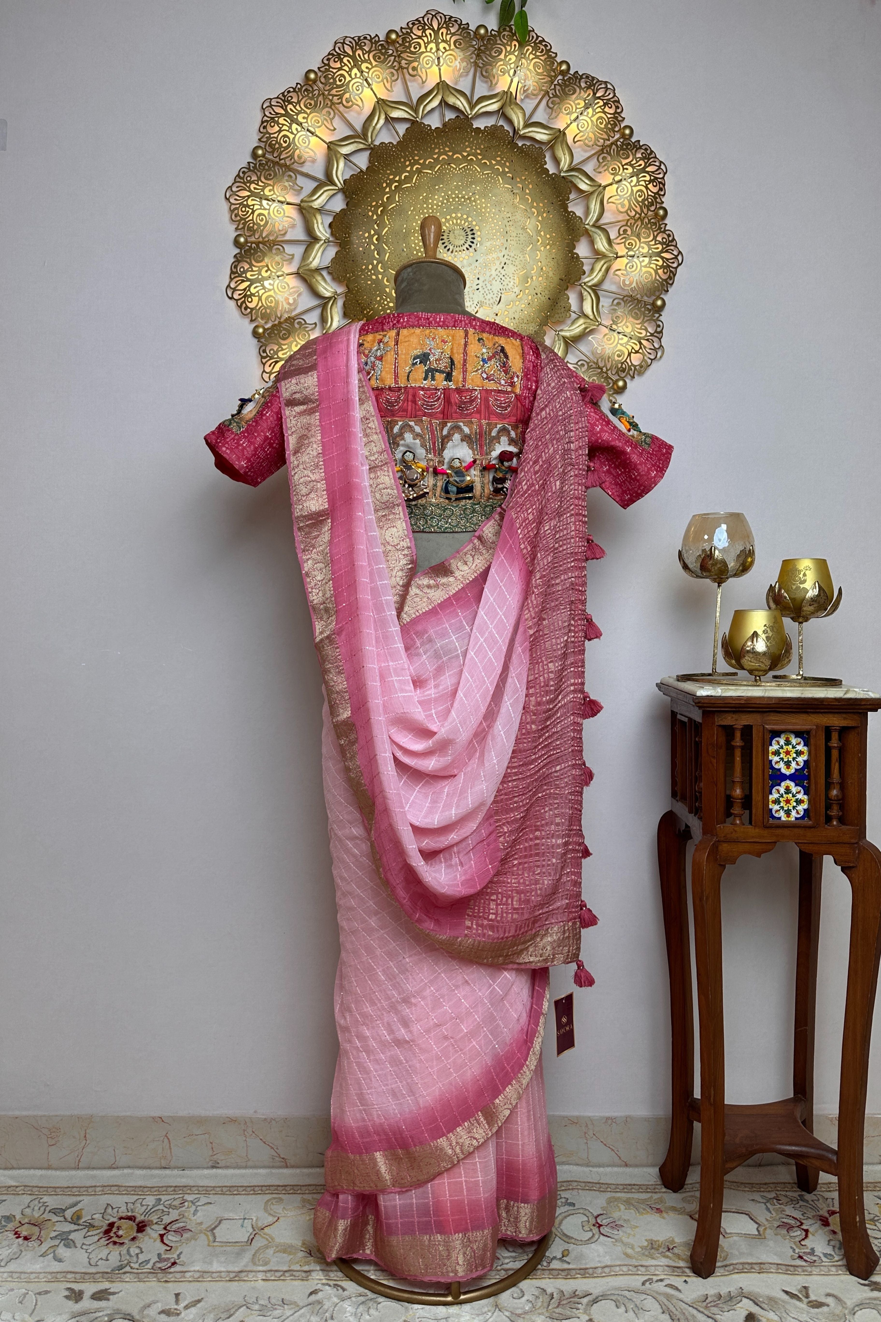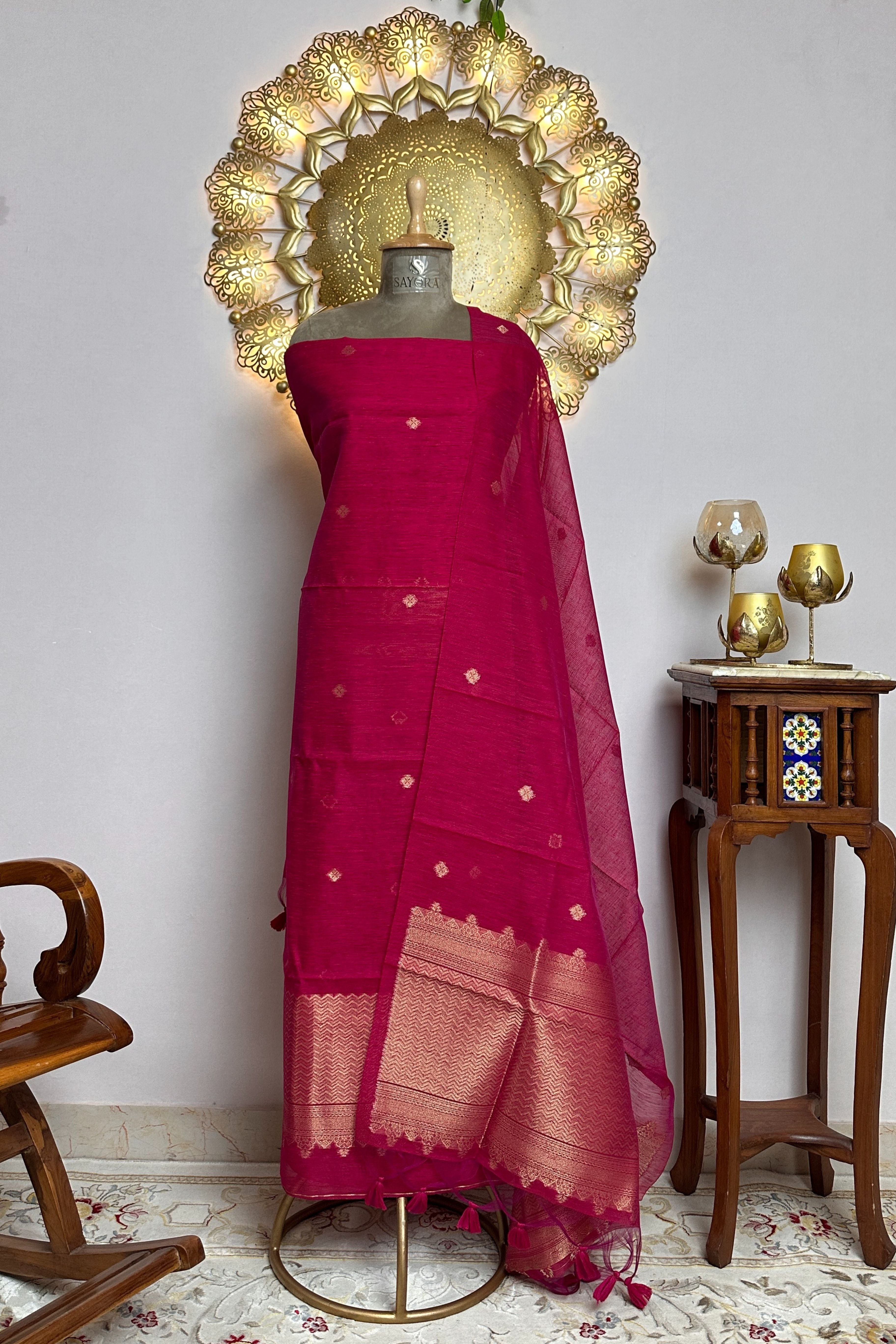 Rani Pink Chanderi Gold Zari Jamdani Weaving Unstitched suit Set