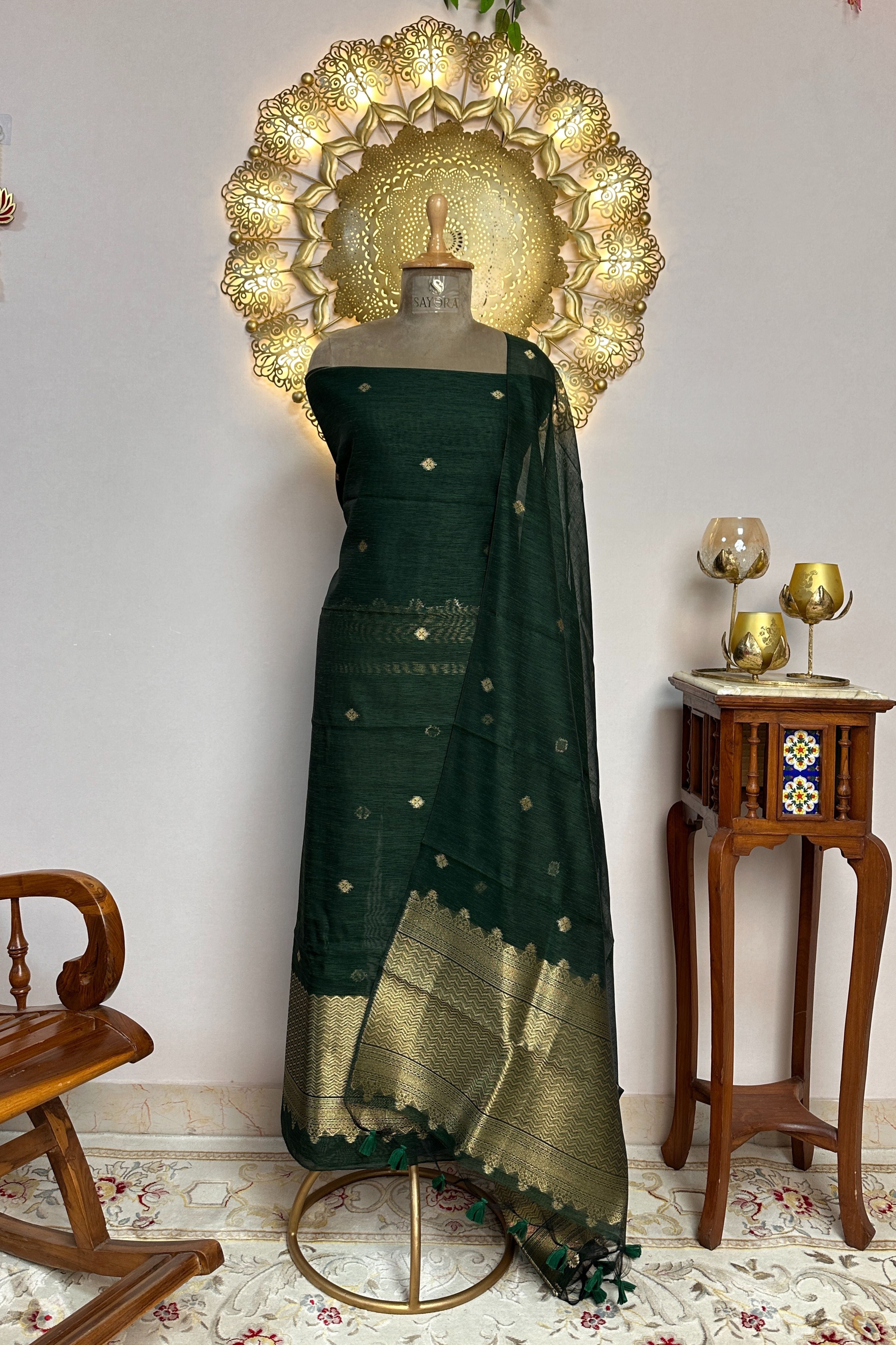 Mehndi Green Chanderi Gold Zari Jamdani Weaving Unstitched suit Set