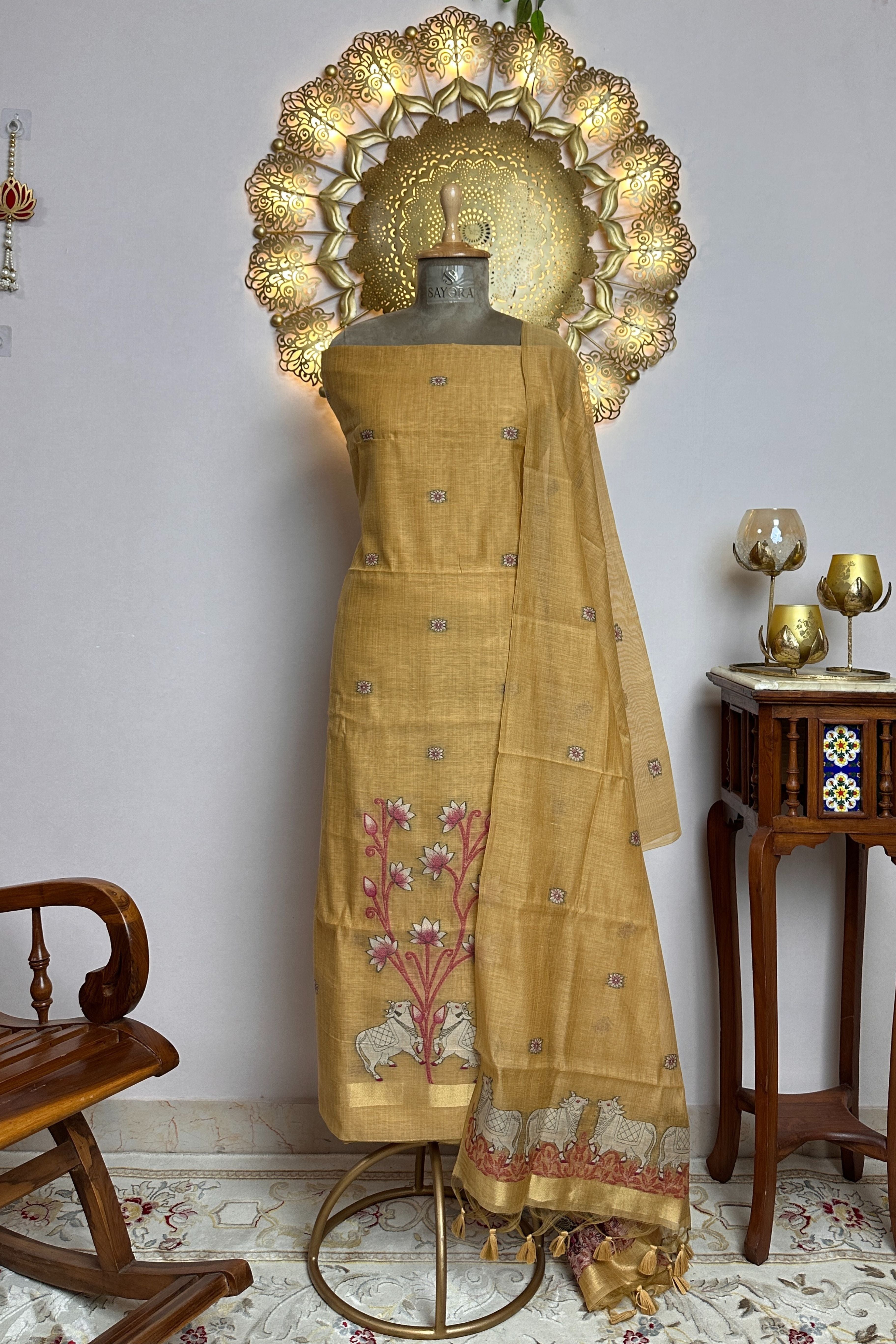 Mustard Yellow Pichwai Jamdani Weaving Linen Chanderi Unstitched Suit Set
