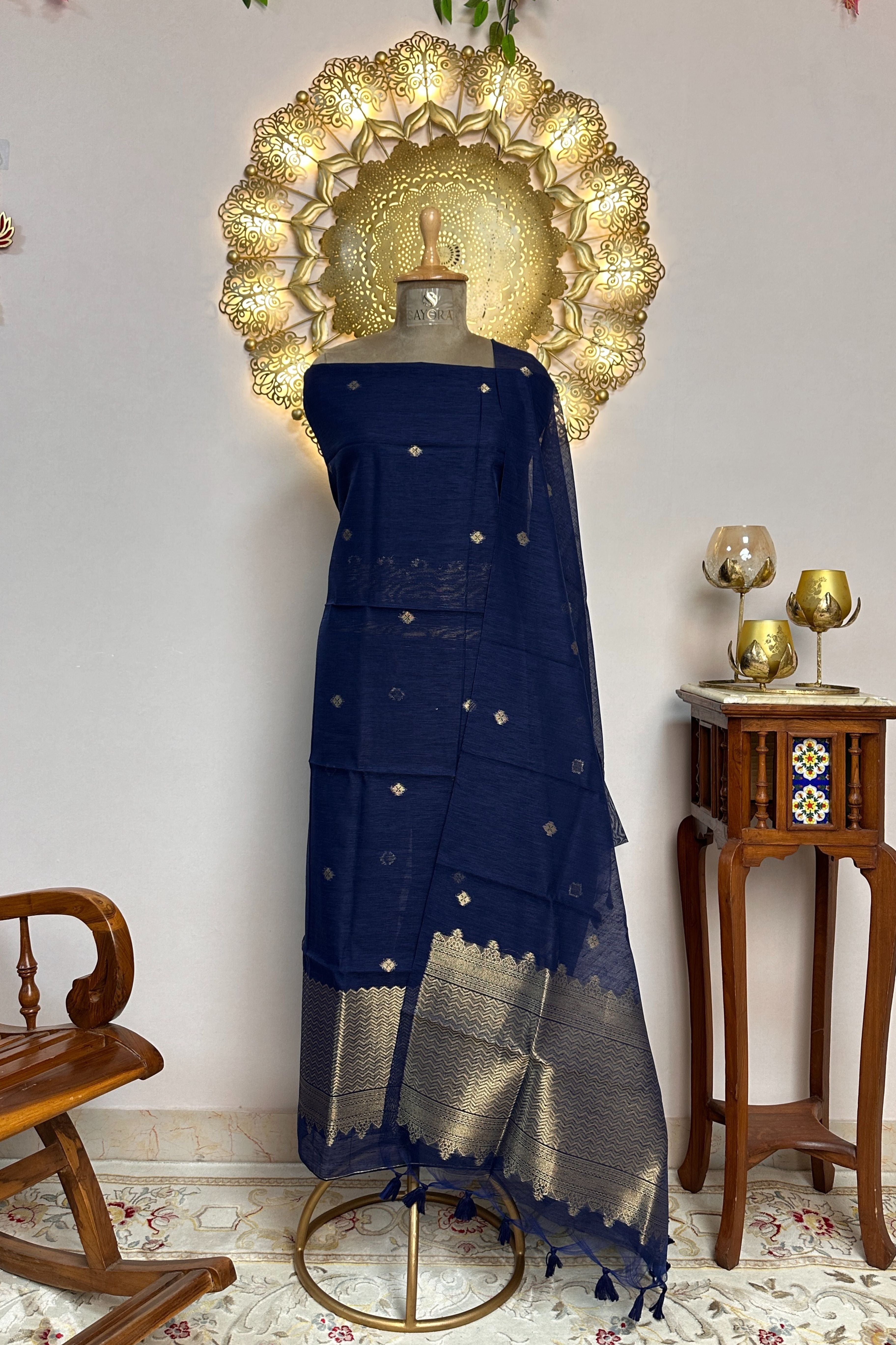 Navy Blue Chanderi Gold Zari Jamdani Weaving Unstitched suit Set