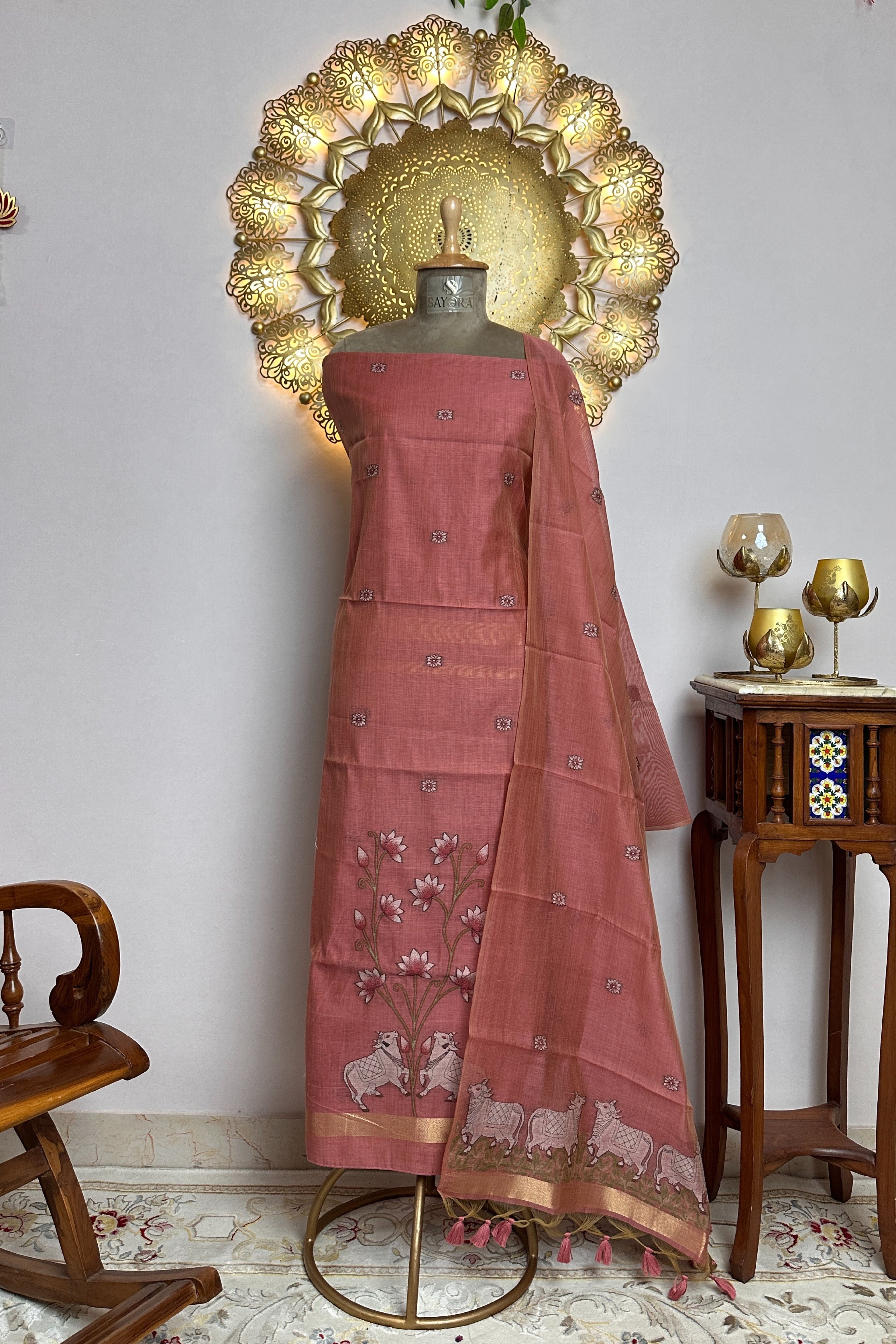 Rust Brown Pichwai Jamdani Weaving Linen Chanderi Unstitched Suit Set