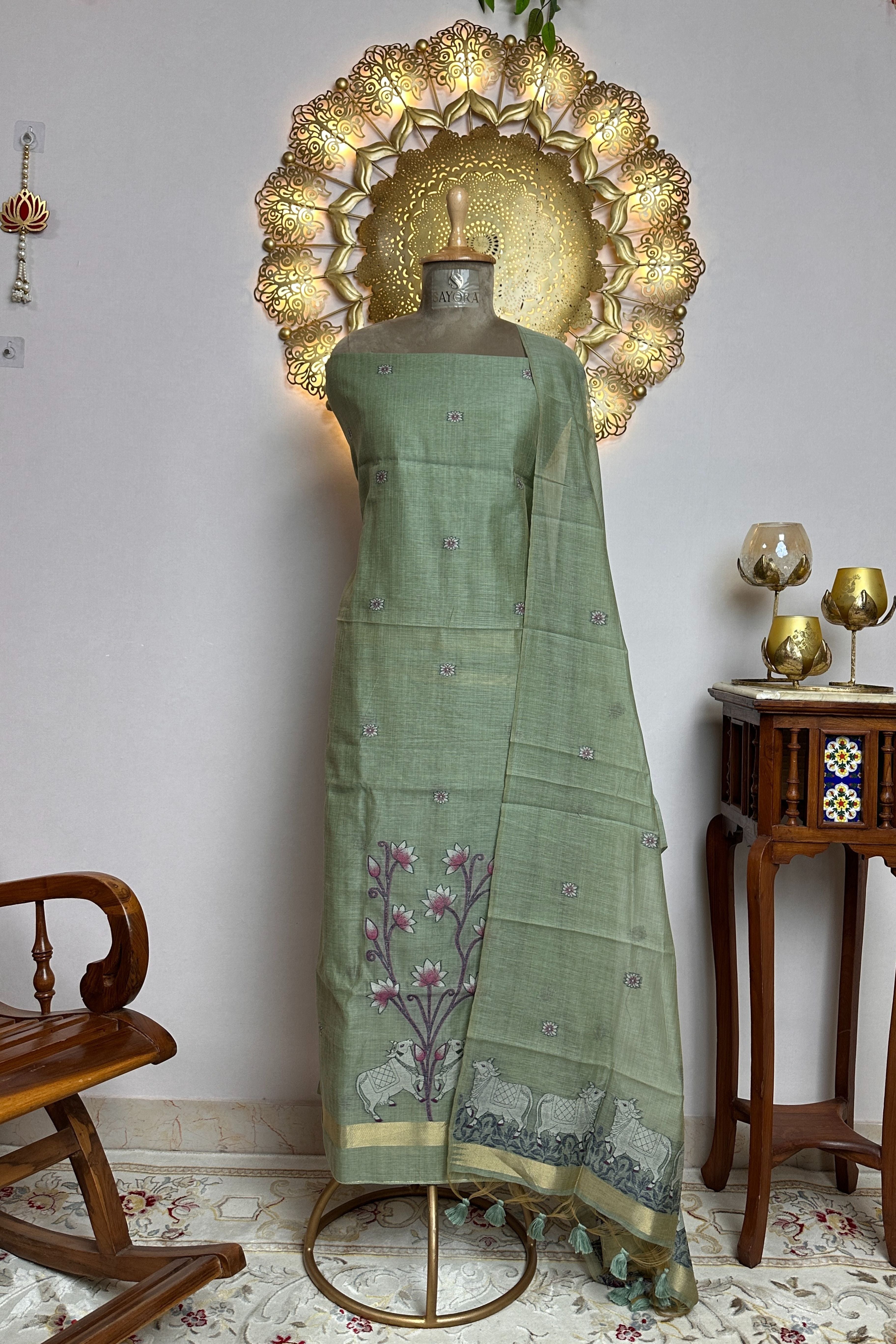 Sage Green Pichwai Jamdani Weaving Linen Chanderi Unstitched Suit Set
