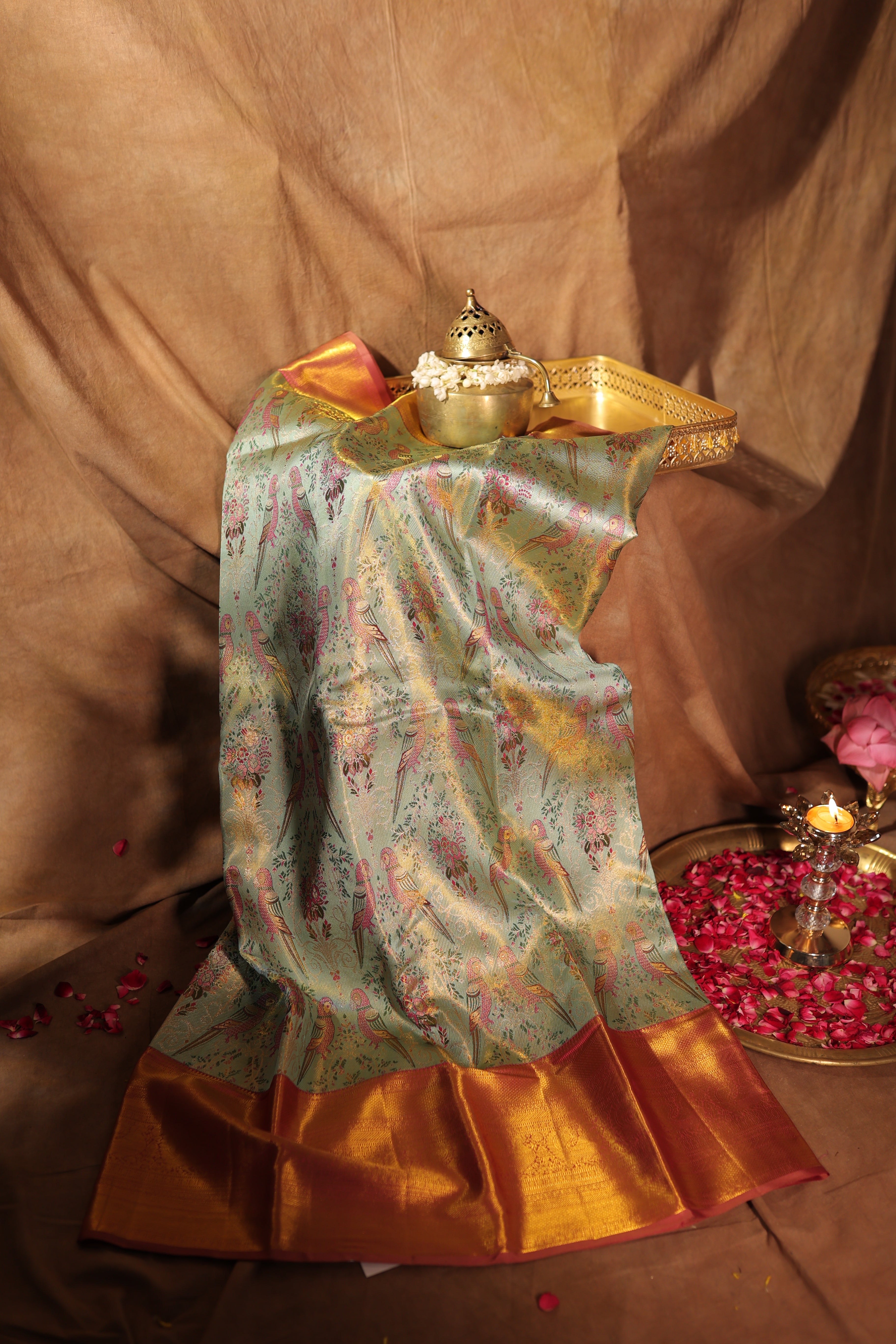Kanjivaram silk Sage Green Parrot motif Zari Border Saree