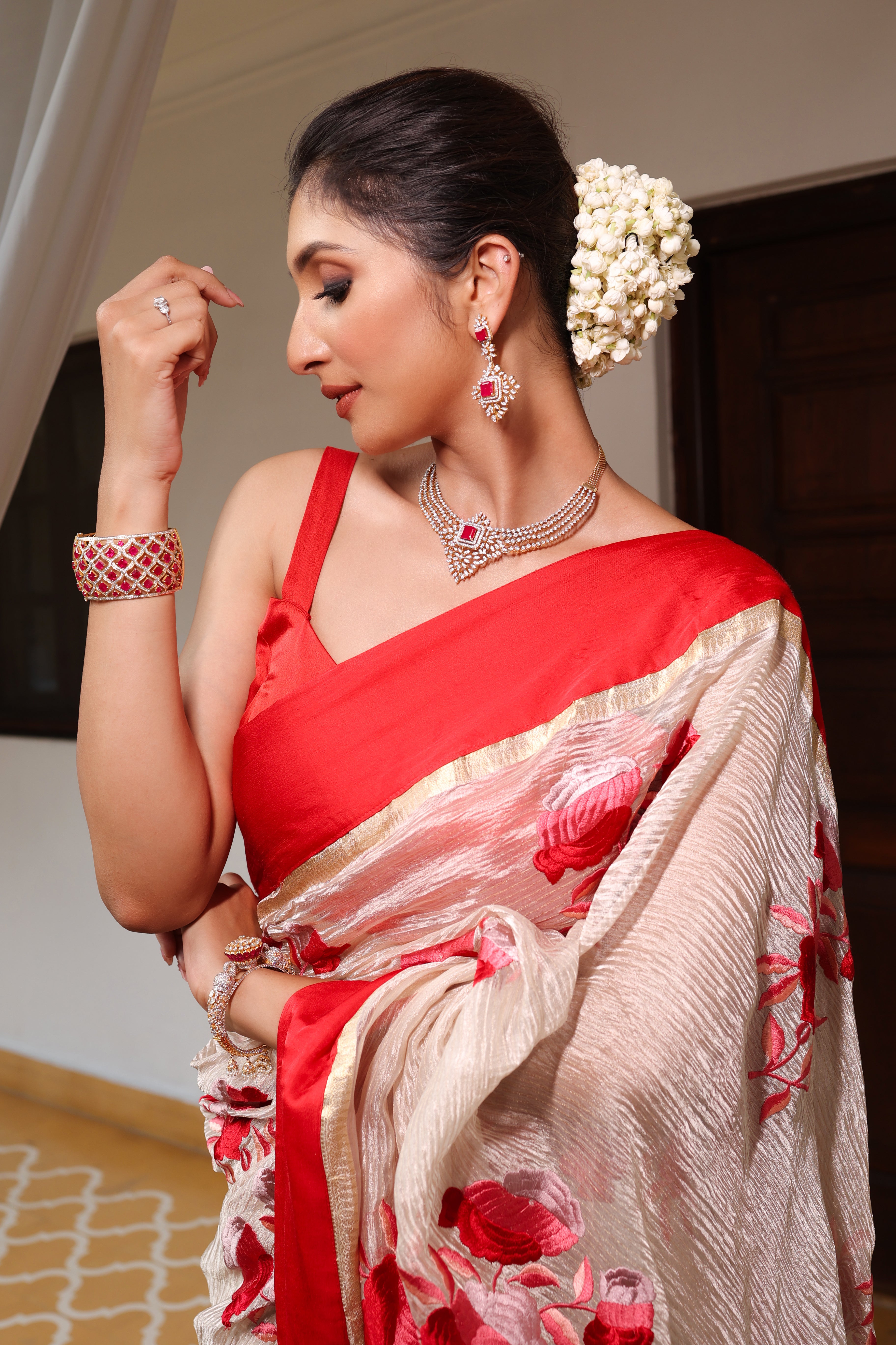 A celebration of femininity and grace, the Floral Fantasy Saree blooms with the timeless allure of red roses. Crafted in...
