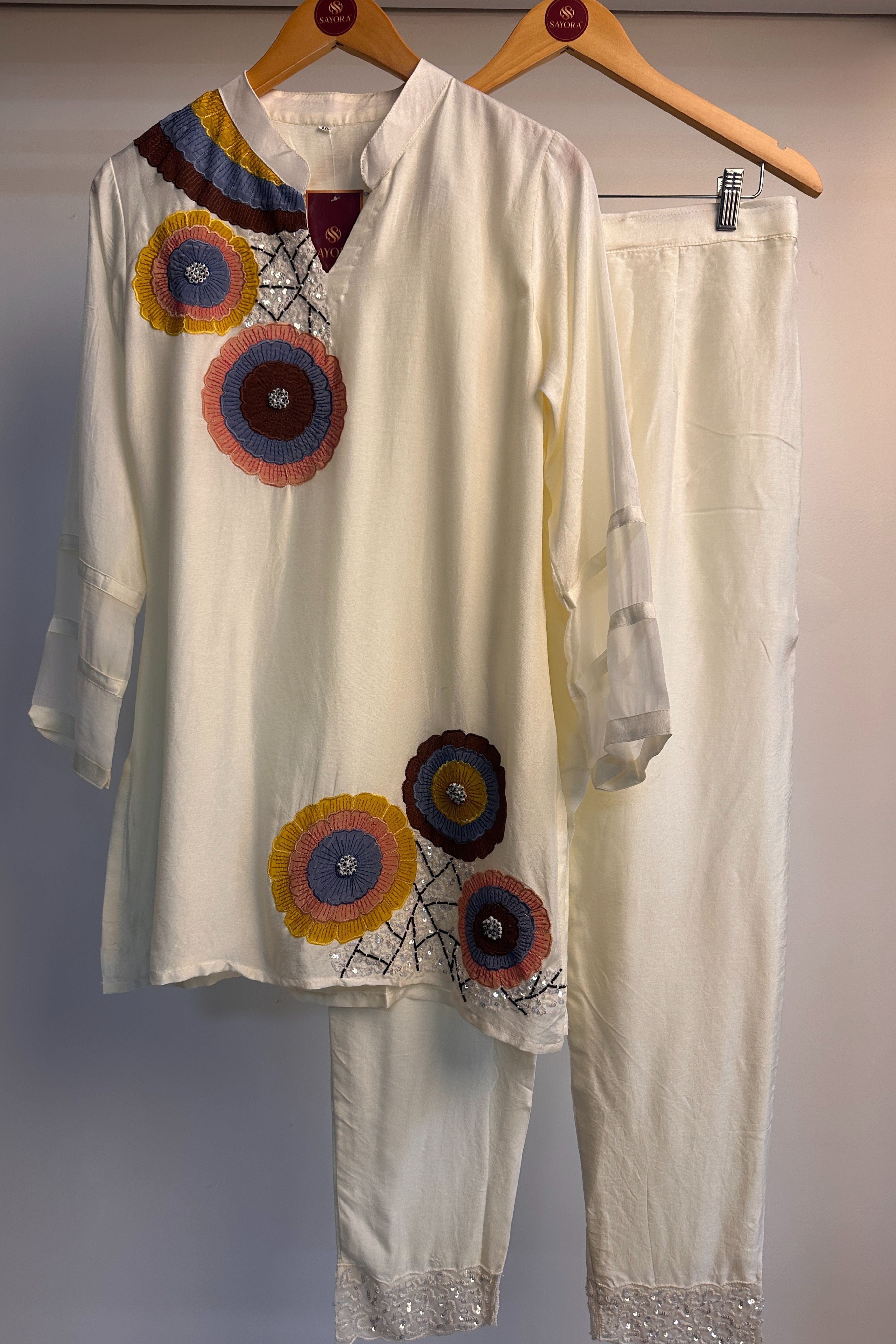 This mulchanderi collar style Co-ord set is purely handcrafted.the multicolour French knot hand embroidery is intricately done on the sleeves...