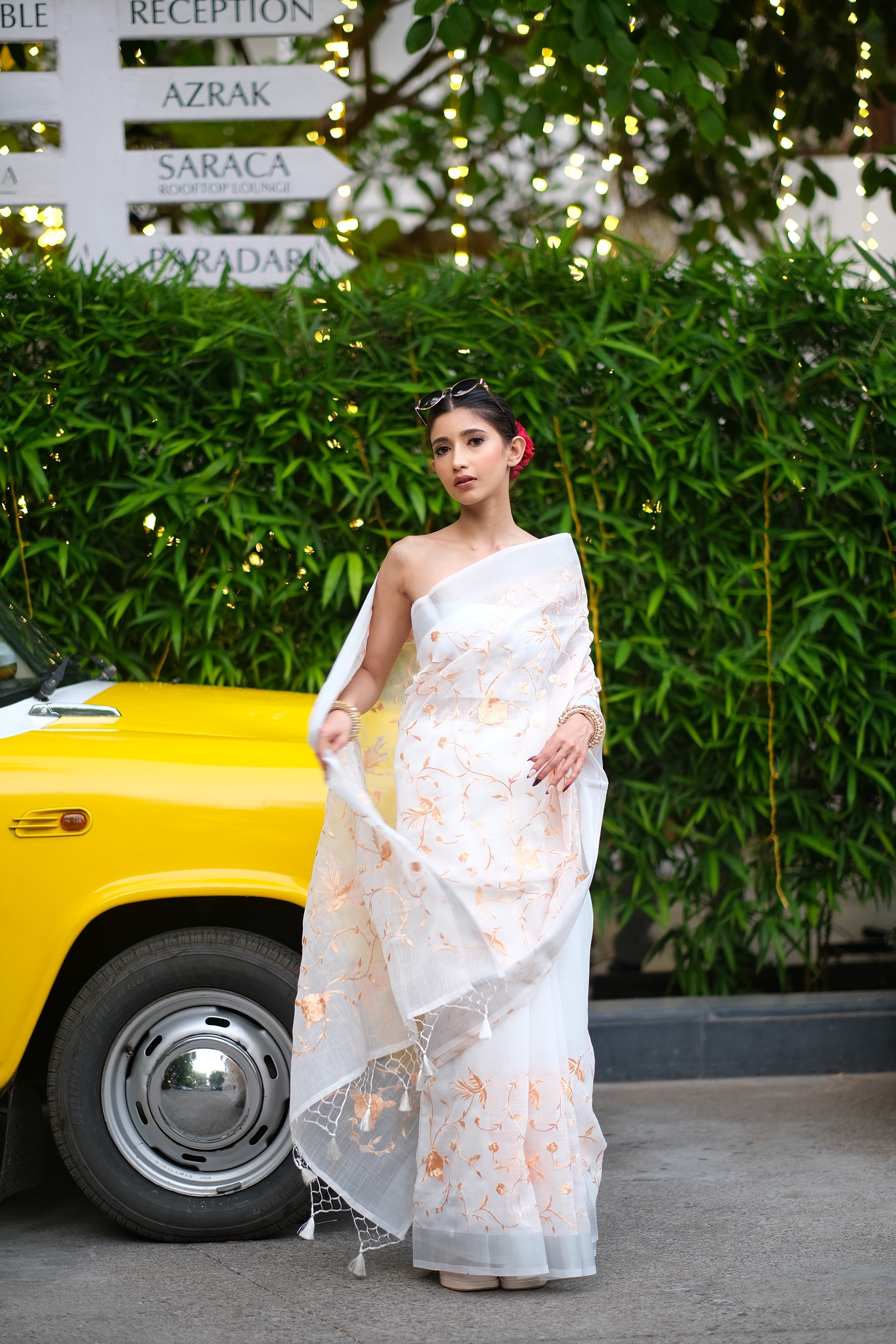 Add a splash of charm to your wardrobe with this beautiful linen saree, featuring whimsical flamingo embroidery that brings a...