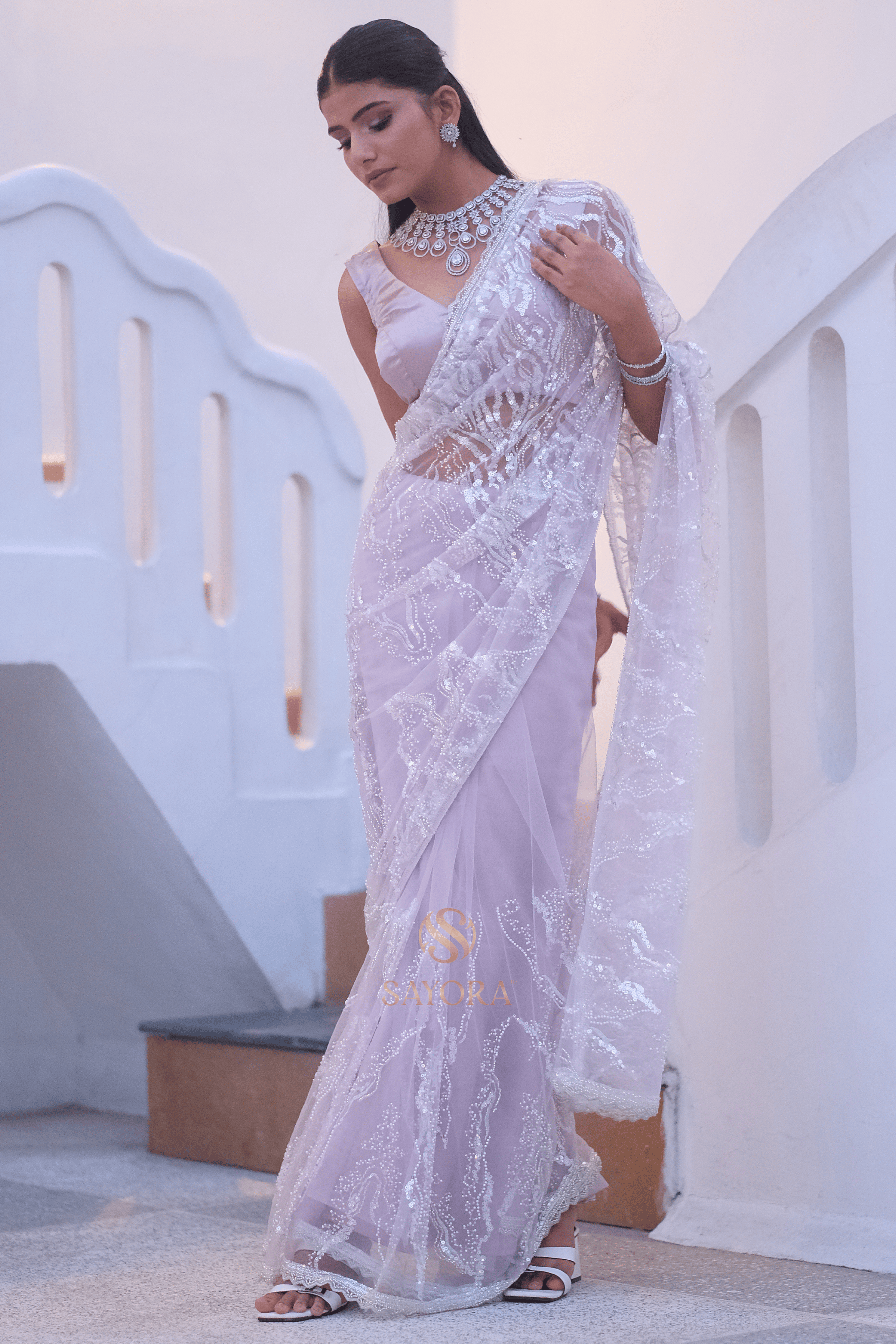 This organza saree, a timeless piece that radiates soft sophistication. Crafted from sheer, lightweight organza, it drapes effortlessly with a...