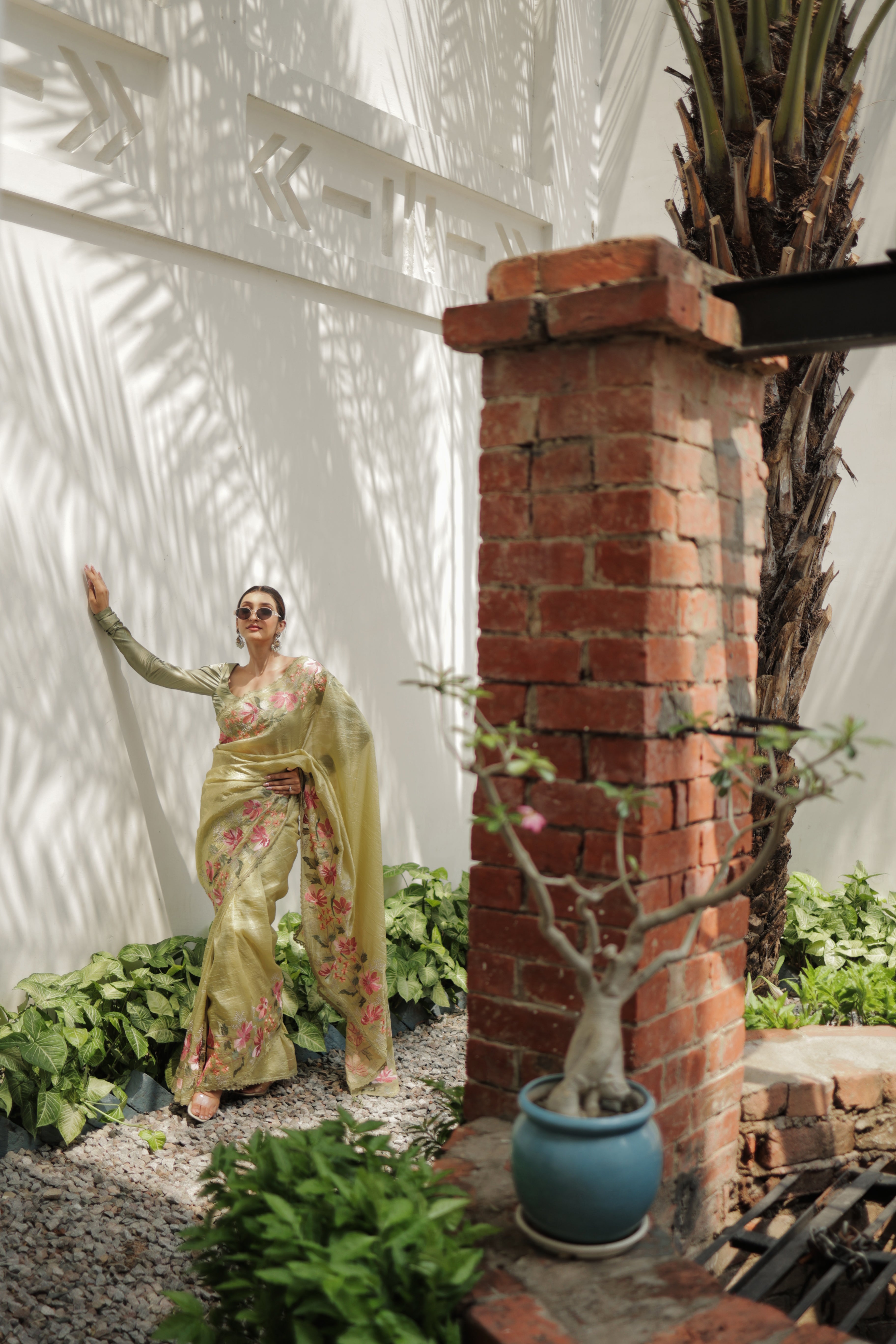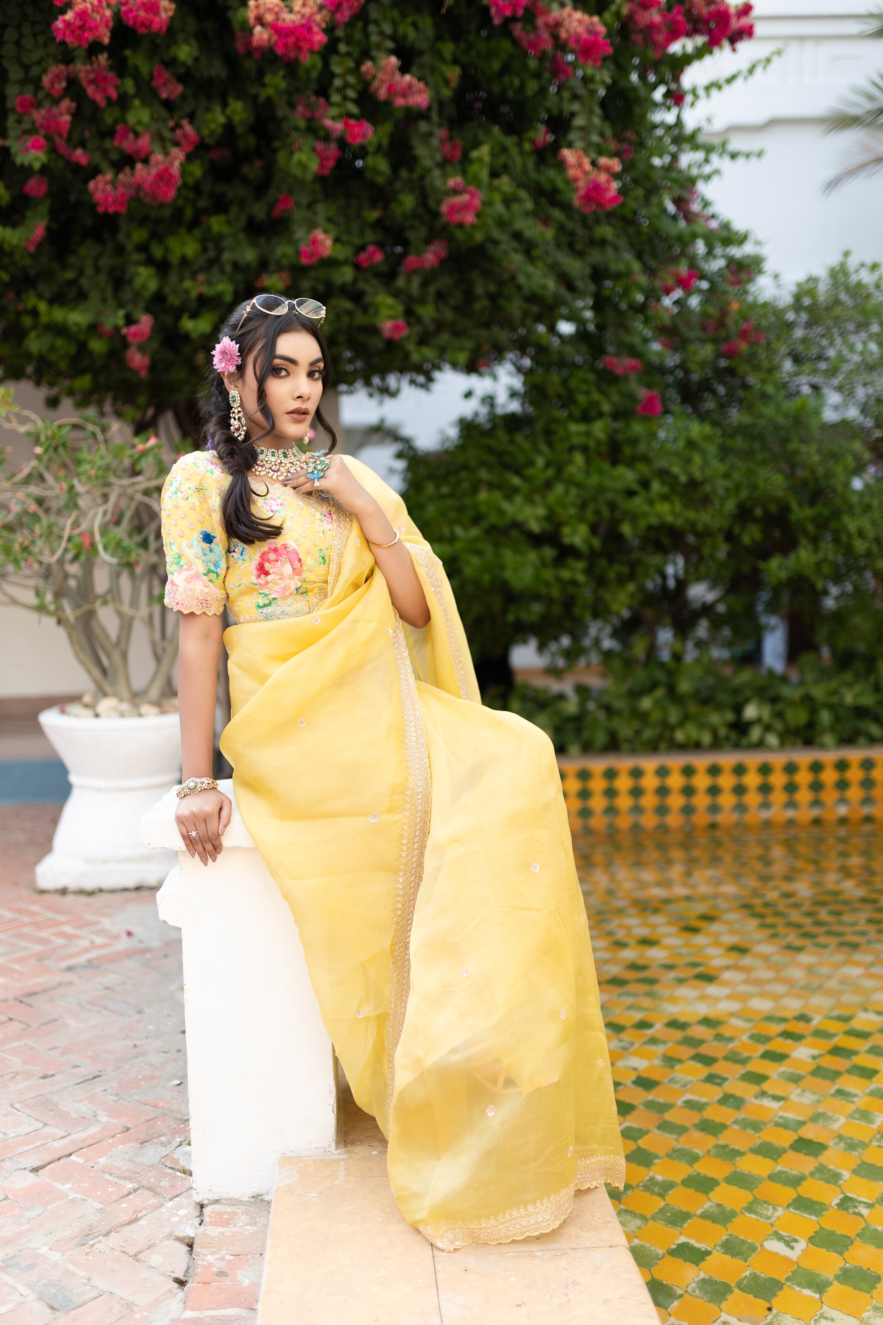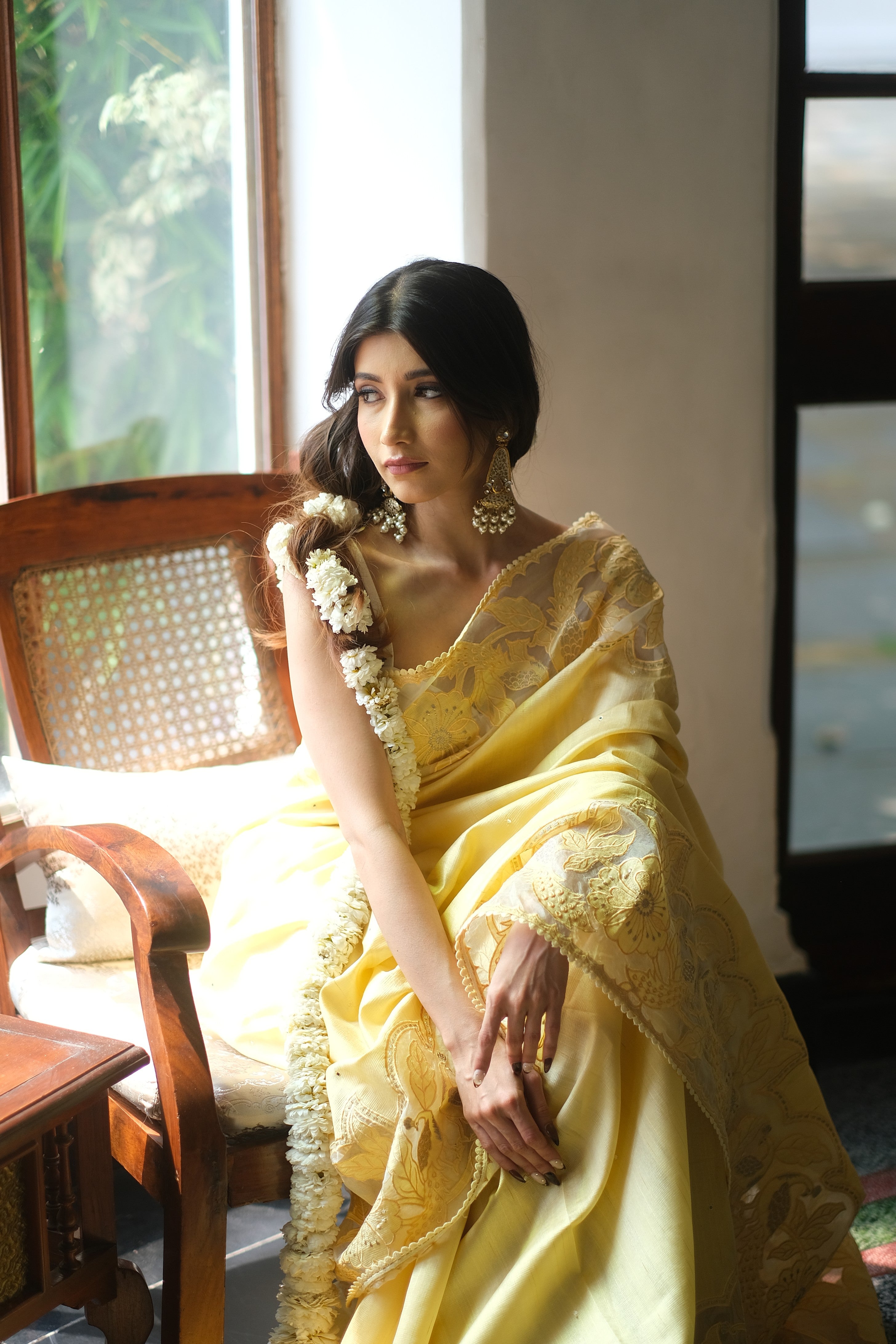 "The Sunshine Saree — a celebration of radiance and refinement,whispers luxury in every detail, Its delicate drape flows like poetry,...