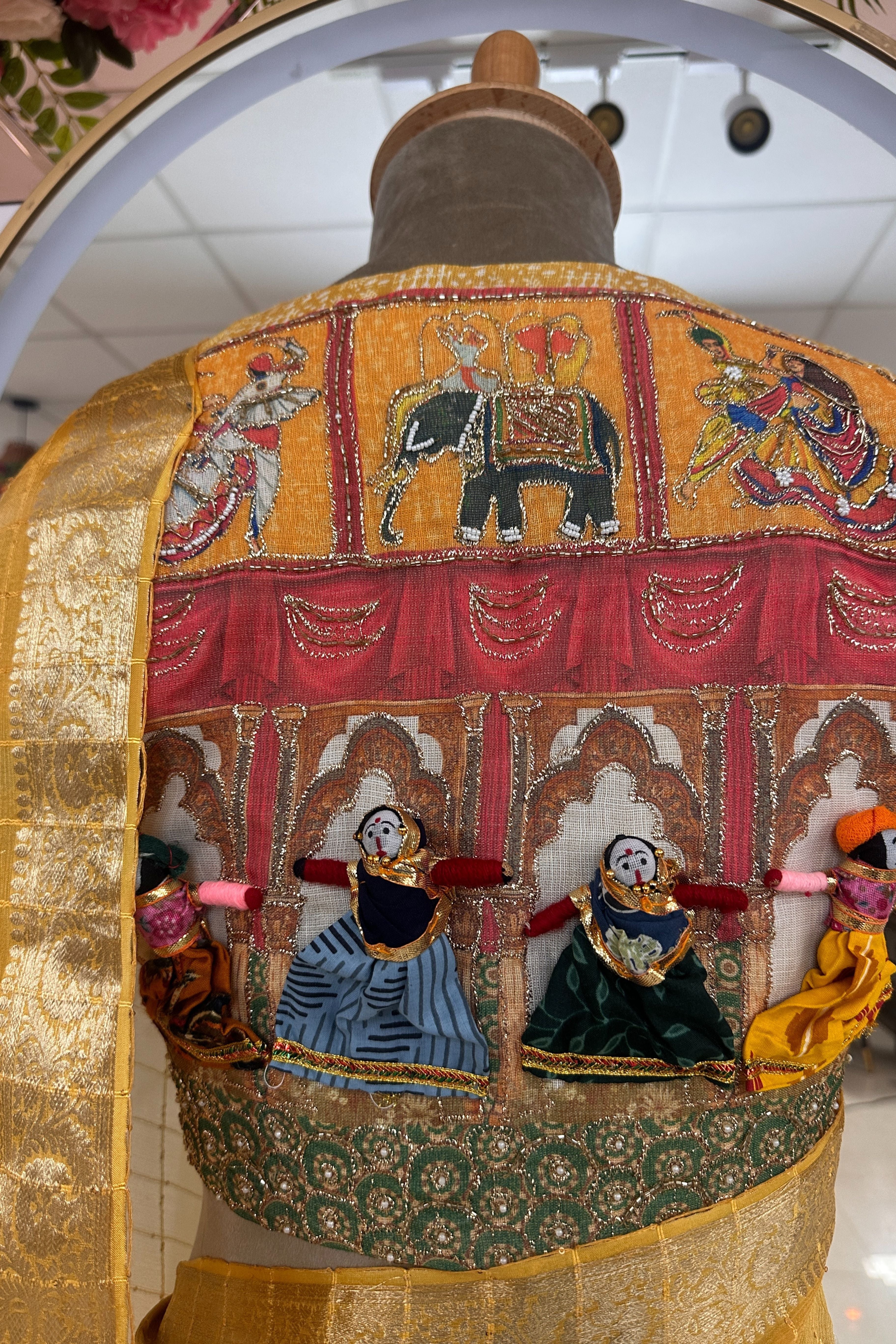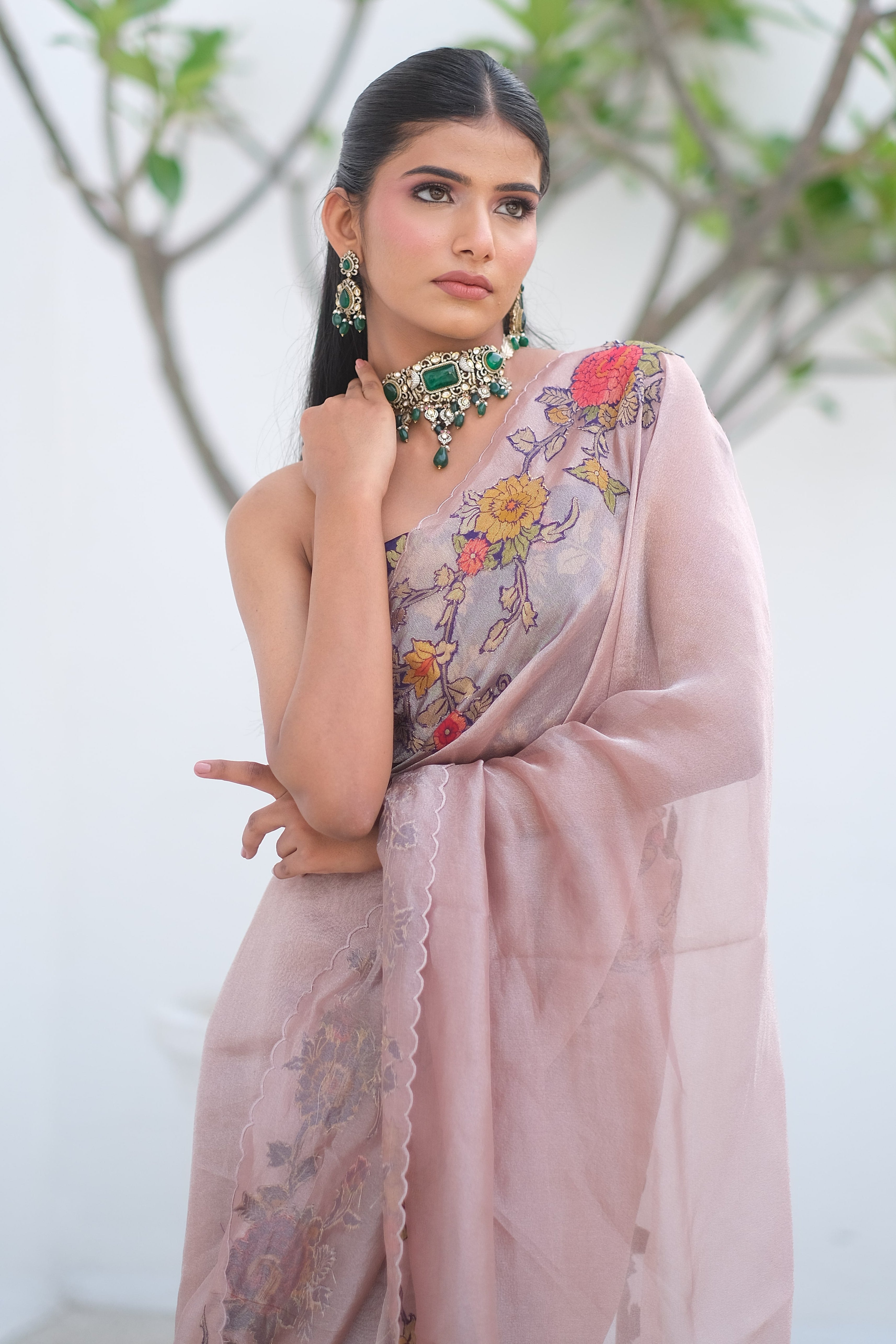 Golden Zari Tissue Organza Saree is an ode to timeless artistry. Handcrafted with precision, it is adorned with intricate Pichwai-inspired...