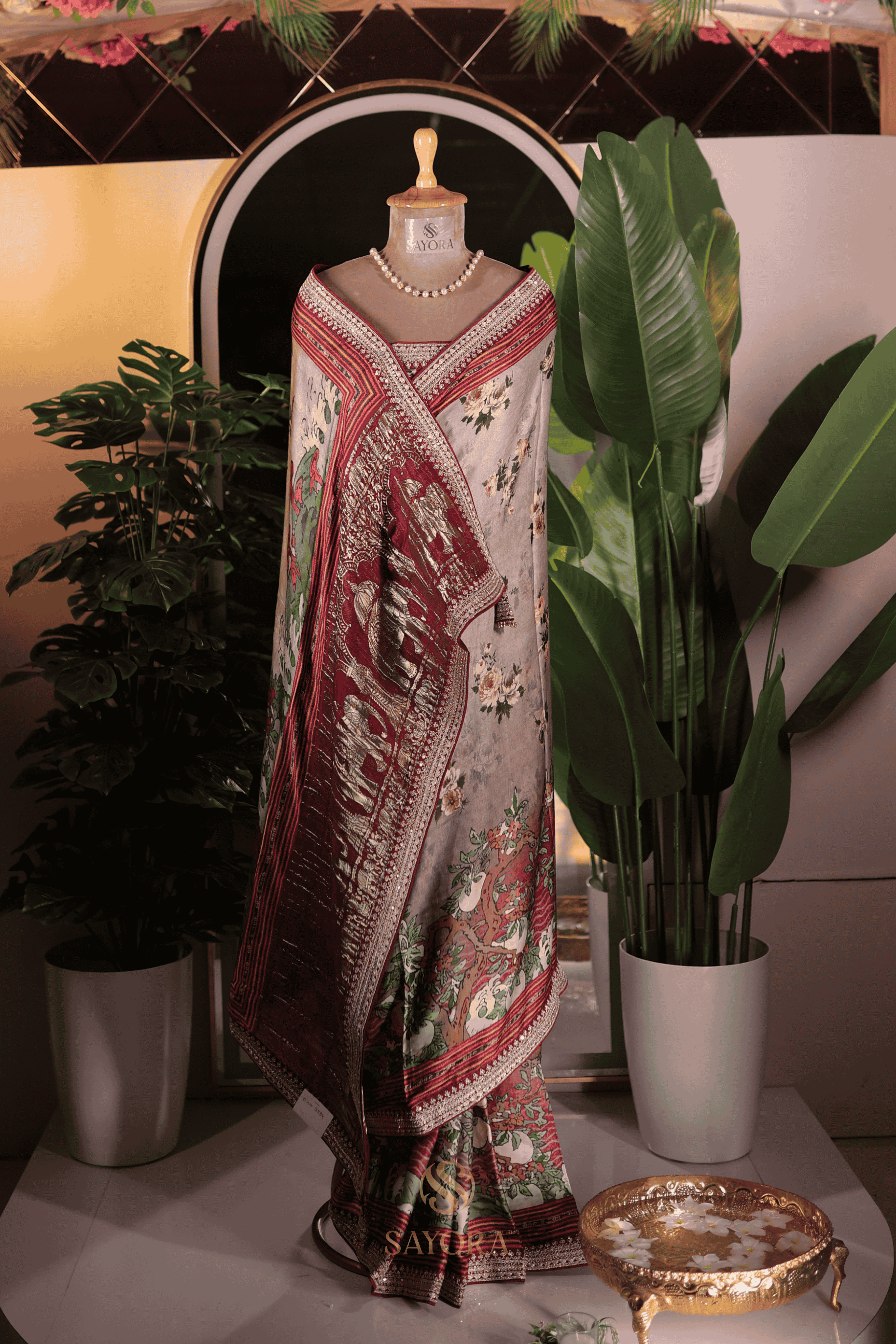 Grey modal silk floral print Elephant nakshi zari woven saree
