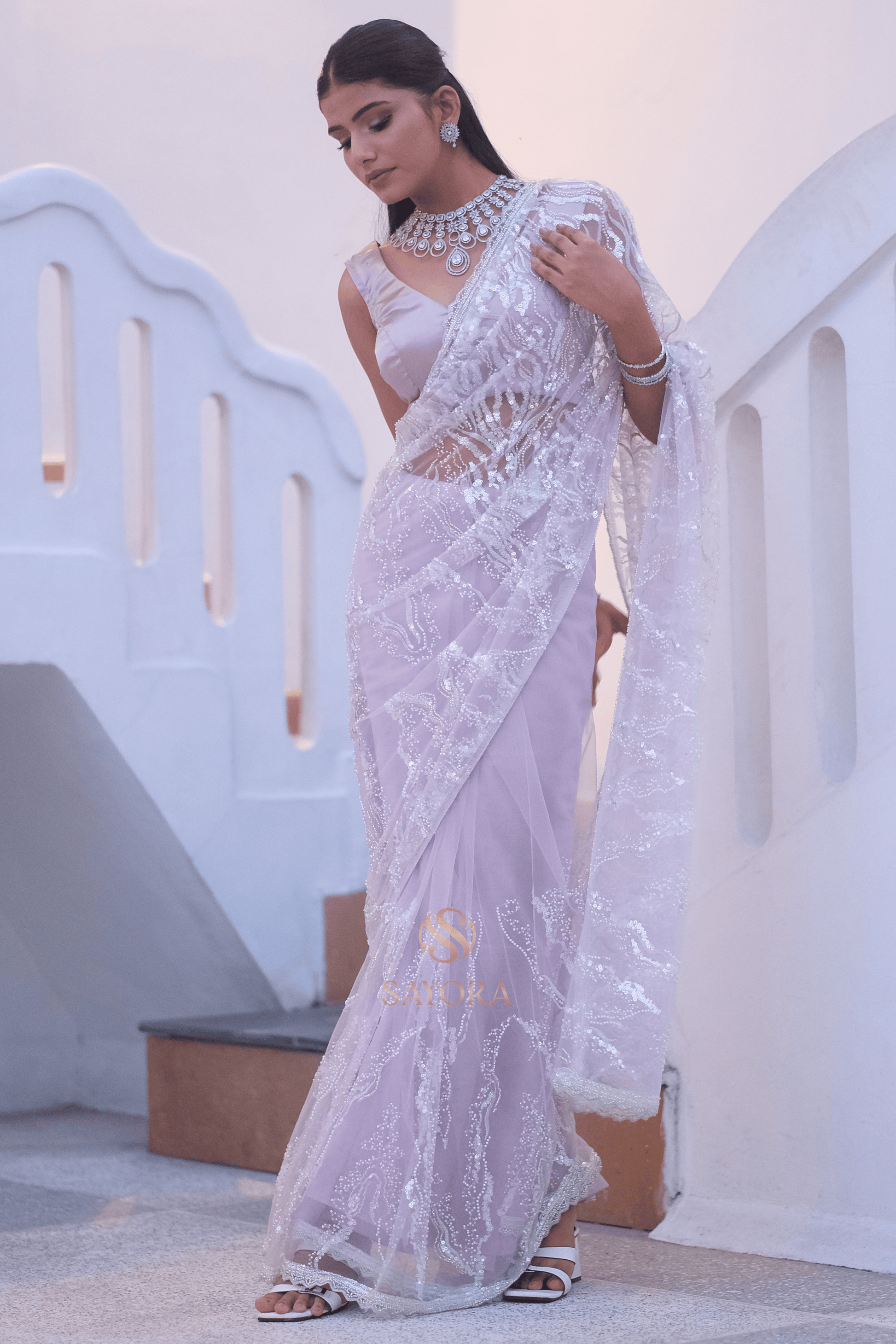 The Chandelier Dream Saree is crafted to capture the brilliance of a timeless chandelier—radiant, opulent, and breathtaking. Designed in luminous fabric that glows with every movement, this saree embodies the perfect harmony of elegance and grandeur adorned with intricate, cascading details that shimmer like crystal droplets, it evokes the charm of royal palaces and grand soirées. With its refined detailing and luxurious finish, this masterpiece is a true statement for the woman who desires to shine with effortless sophistication.