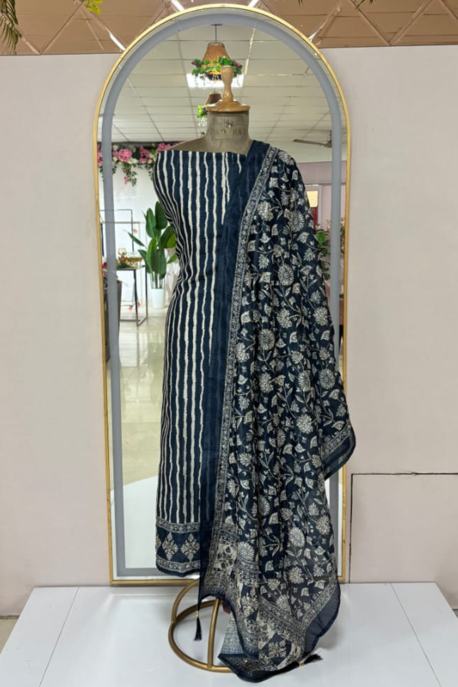 Vertically striped khadi silk 3 piece unstitched suit set in navy colour with butons detailing on the neckline. kantha thread work dupatta with floral prints makes it very elegant & chic for evening office parties & day Parties.