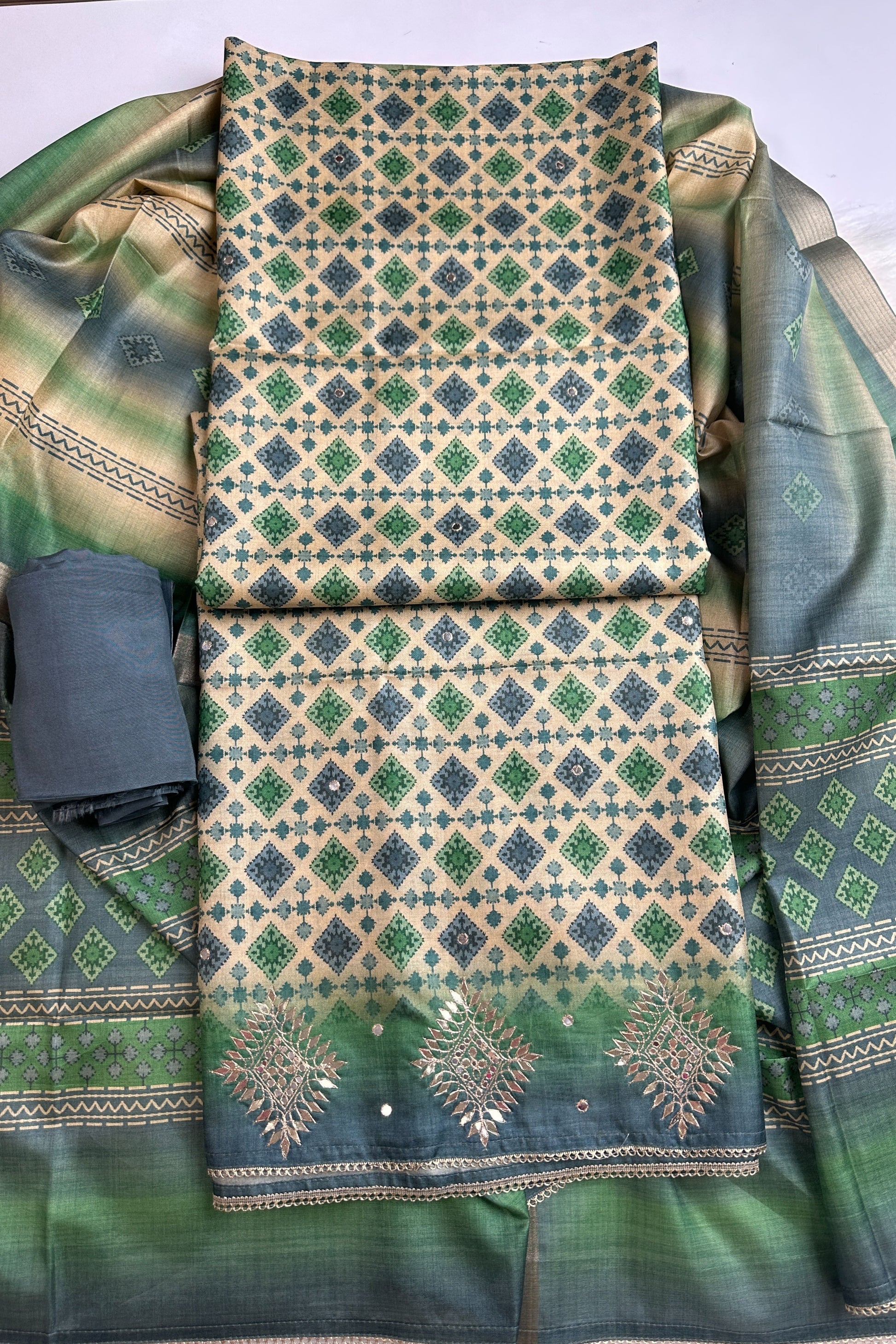 Geometric printed cotton silk 3 piece unstitched suit set in teal colour making it perfect for official use & day outings. Paired up with Abstract digital printed dupatta & muslin pants for a very breezy & comfortable look.